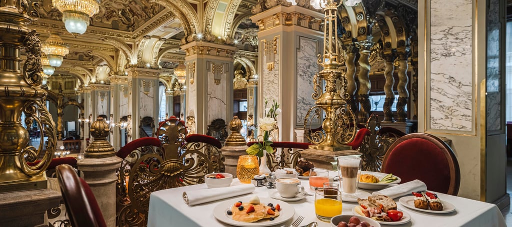 At the heart of the hotel lies the New York Café itself—a cultural institution in its own right, originally frequented by writers and thinkers from Hungary’s literary Golden Age. The café was meticulously restored with mosaic flooring, carved stucco columns, frescoed ceilings, and a magnificent chandelier under a painted dome. Today it serves as a luxurious setting for breakfast, high tea, and elegant dining, where Italian-inspired dishes and gourmet pastries meet local coffee traditions. Waitstaff, donning historically styled uniforms, present formal yet welcoming service behind marble counters under gilded arches, reinforcing the space’s storied ambiance. Signature desserts like layered chocolate tortes, artisan gelatos, and Viennese-style pastries reflect both culinary quality and artistic presentation. Lunchtime offers seasonal dishes—from creamy pumpkin risotto infused with Hungarian spices to delicate seafood entrées inspired by Central European traditions. Whether sipping espresso beneath cupolas or sharing high tea with live piano, the café delivers gastronomy and grandeur that few hotel restaurants can match.