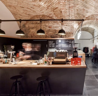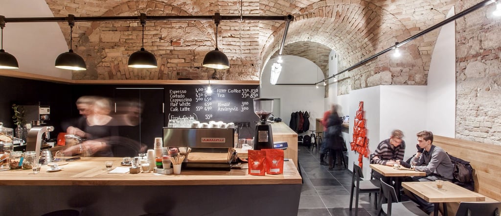 Espresso Embassy stands as a founding pillar of Budapest’s third-wave coffee culture, notable for being one of the earliest cafés to elevate bean quality, brewing precision, and ethical sourcing in the city. Established in 2012 by barista champion Tibor Várady and his partner, the café was part of a decisive shift away from commodity espresso toward specialty methods like V60, Chemex, and AeroPress. Set within a classicist urban palace dating from the early 19th century, the interior retains original stone-brick vaulted ceilings and bohemian mixed-texture walls uncovered during renovation. Sporaarchitects transformed the space by pairing raw historic surfaces with minimalist oak-steel furnishings, water-pipe lighting, and a copper tap that guests use to refill filtered water. It was conceived not just as a café but as a cultural hub, where students, professors, creatives, and travelers intersect over single-origin brews and locally roasted beans. Espresso Embassy remains true to its founding vision—craft-focused coffee, community building, educational hospitality, architectural authenticity, and sustainability ethos.