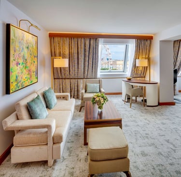 Stepping into a guest room, whether a Deluxe Room or Presidential Suite, is like entering a modernist canvas with tones of cream, charcoal, and teal layered above soft carpet. Spacious layouts offer large desks, smart climate control, blackout drapes, and marble bathrooms with deep soaking tubs and rainfall showers. Rooms feature local design touches such as embroidered Hungarian motifs, custom carpentry made by local artisans, and curated Hungarian literature on bedside tables. The suites explore expansive views of Erzsébet tér, Grand Boulevard or the Danube, stretching daylight from sunrise to sunset across dramatic vistas. Subtle art pieces such as abstract Hungarian tapestry or sculptures enhance the contemporary aesthetic without overwhelming. High-speed Wi-Fi, multimedia hubs, renewable water filtration systems, and minibar options featuring Hungarian wines and craft spirits align with a thoughtful modern stay. The integration of modern comfort, spatial generosity, local craft detail, technical design, and urban panorama creates a guest experience that feels thoroughly contemporary yet rooted in local identity.