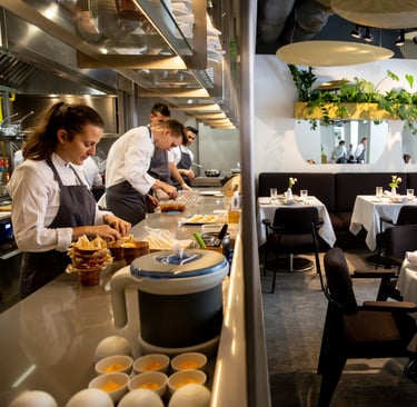 Upon arrival, guests are welcomed into a calm vestibule leading to a modern, airy dining room. Cocktails and aperitifs may be offered, setting a tone of refined expectation. The chef unveils each course slowly: each dish arrives with a concise narrative—whether reflecting Széll’s childhood in rural Hungary, Szulló’s grandmother’s goulash, or the symbolic role of sterlet as an interface between freshwater ecosystems.